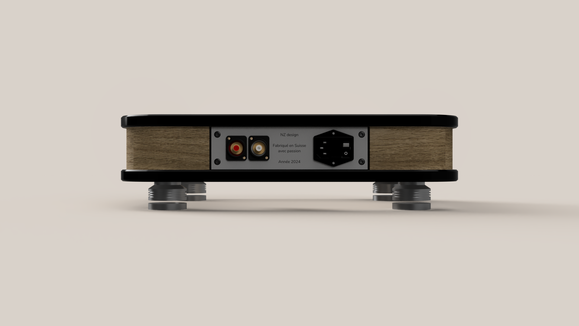 La face arrière reçoit l'interrupteur d'alimentation et les embases RCA. Cette face est facilement démontable et interchangeable, différentes connexions peuvent ainsi être envisagées.
