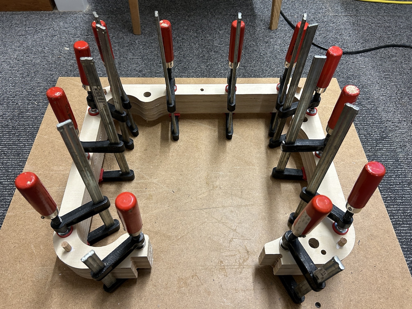 L'âme est constituée de 3 pièces en multiplis de 18mm. Des tourillons de guidage sont percés dans les angles pour faciliter l'alignement lors du collage.