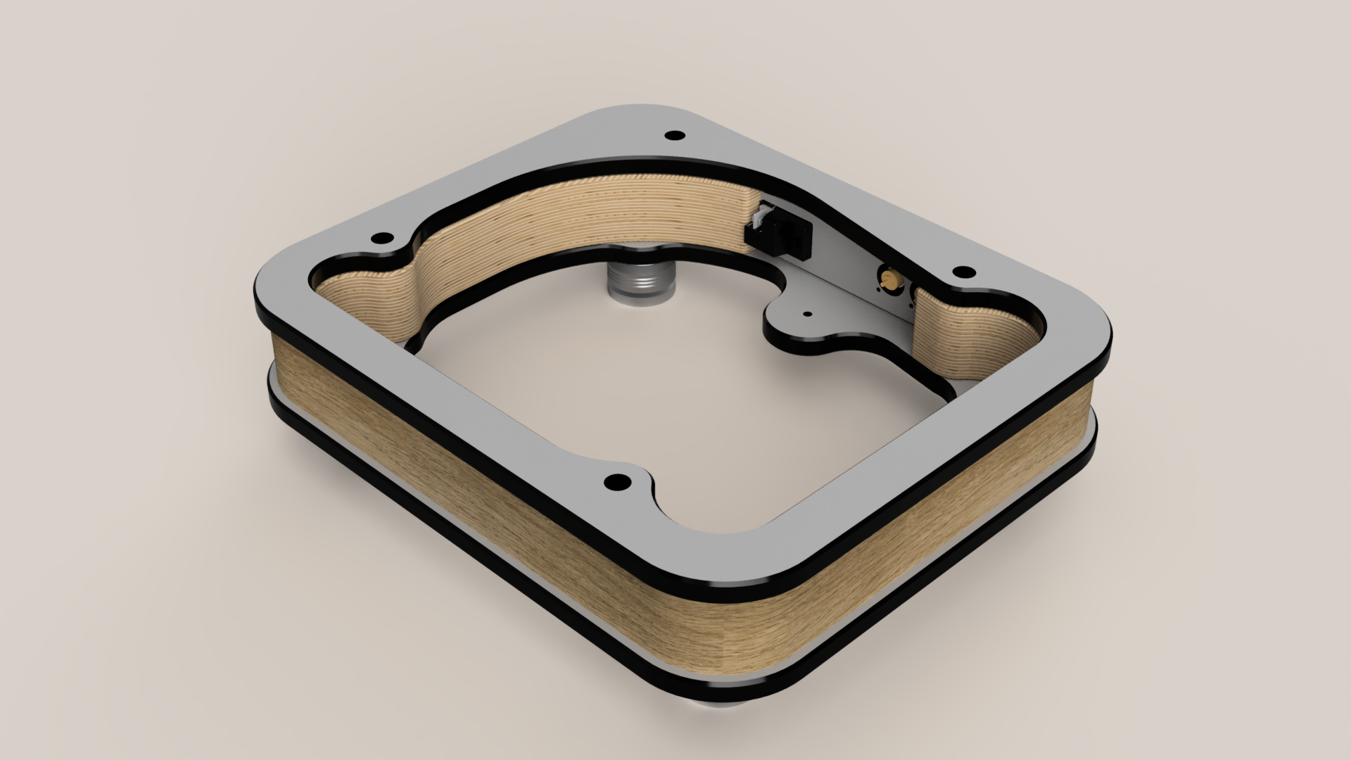 L'âme du socle se voit revêtue d'un placage chêne de fil. L'utilisation de colle de contact permet de s'affranchir de gabarits et garantit une excellente adhésion dans les angles arrondis.