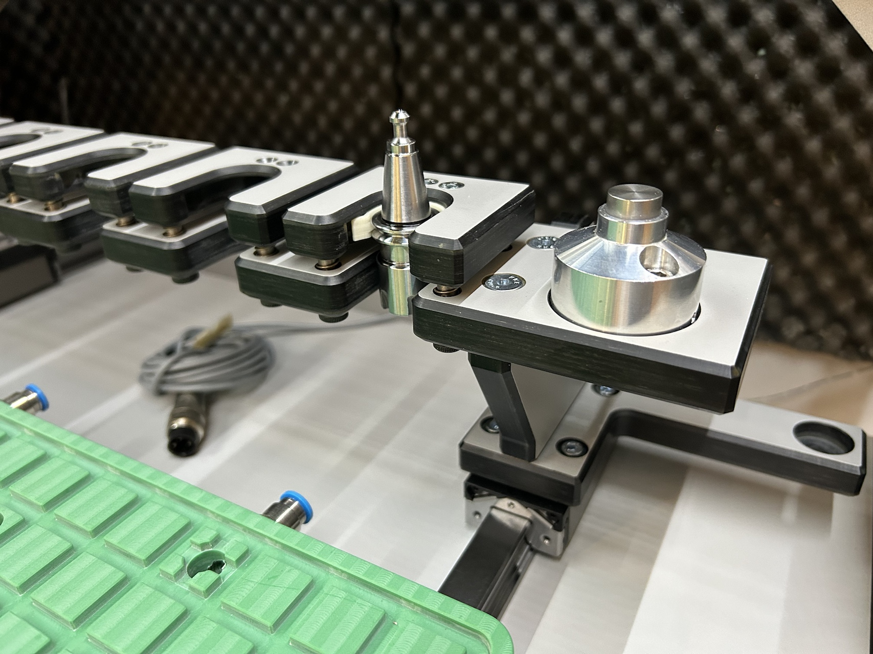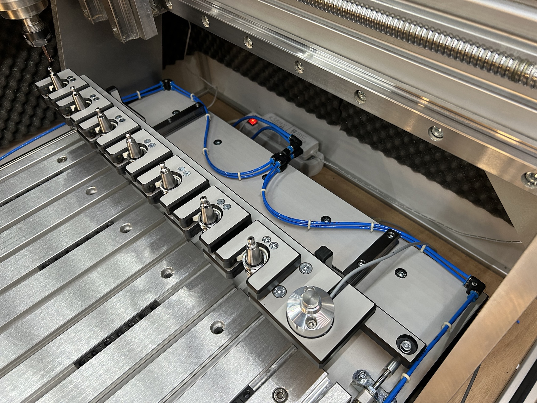 Initialement prévu pour 8 outils, le magasin n'en contiendra finalement que 7 afin d'y intégrer le palpeur d'outil. Cette configuration a plusieurs avantages, le palpeur n'empiète pas sur la surface de travail et le temps de palpage est plus court car un retrait du magasin n'est pas nécessaire entre la prise et la mesure de l'outil.