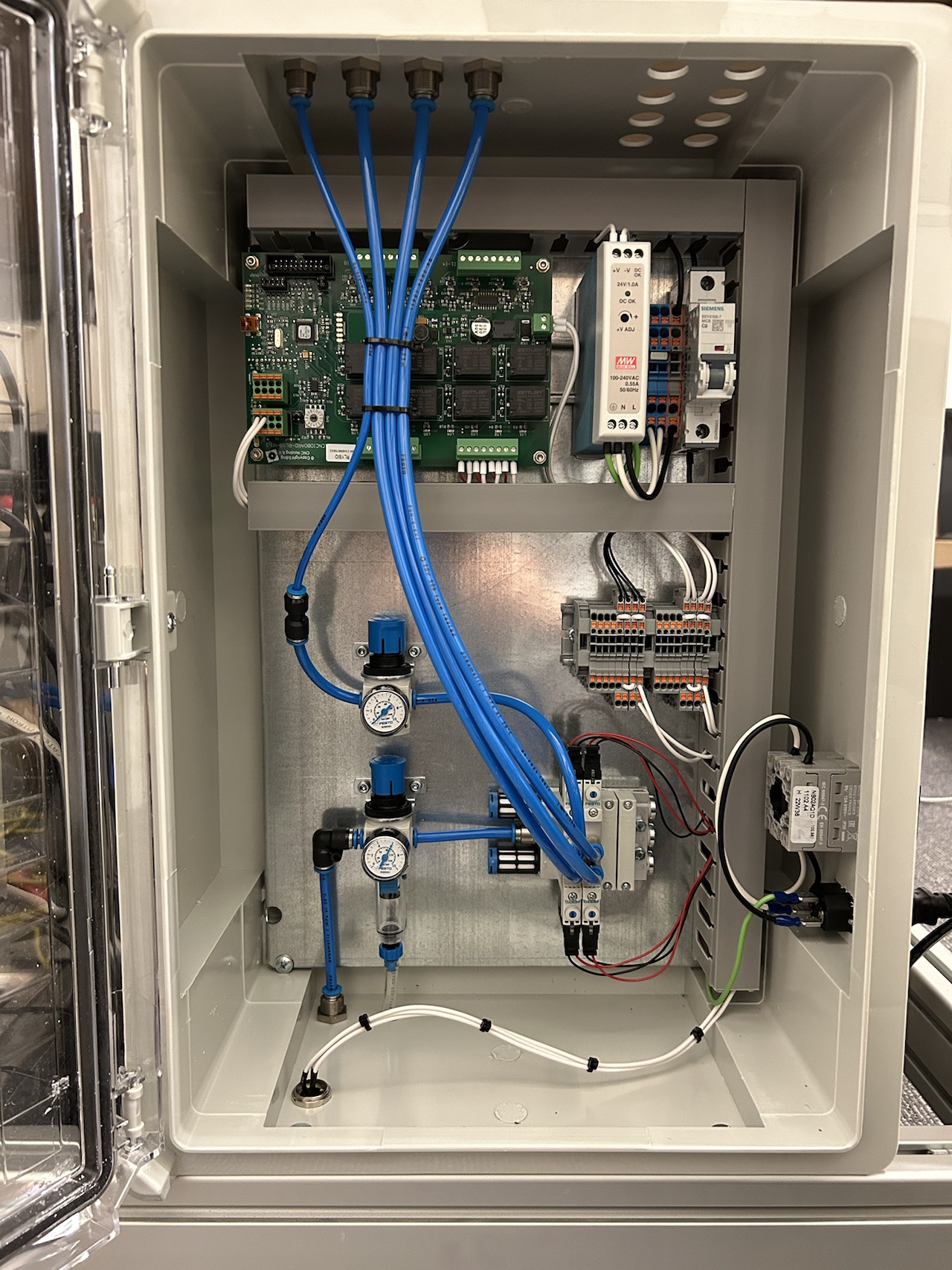 Un tableau de commande pneumatique dédié est réalisé. On y trouve en partie haute la carte de commande connectée au contrôleur principal en RS-485. Cela permet une connexion simple ajoutant 8 entrées et 8 sorties.