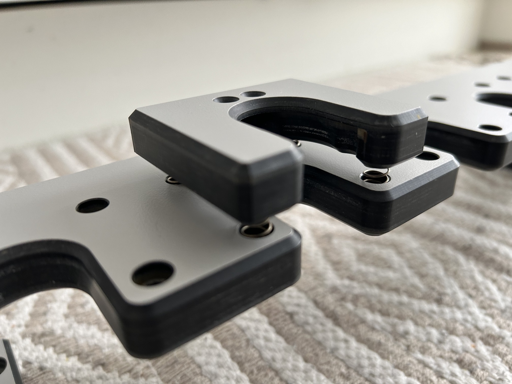 Cela implique une grande précision et une bonne rigidité de l'ensemble, nous utilisons donc des guidages linéaires pour le mouvement. Les chariots viennent buter contre la table rainurée en aluminium, leur positionnement précis est donc assuré.